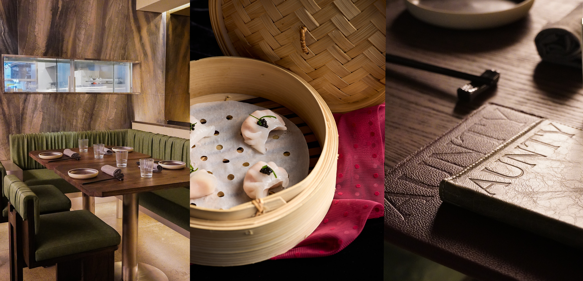 Design-wise, Aunty strikes the perfect balance between moody intimacy and polished sophistication, capturing the essence of a traditional Cantonese teahouse, but reimagined for James Street’s crowd. Spanning 400sqm and seating up to 100 guests, the space is crafted for intimate dining, using levels, booths, and curtains to transform a single room into multiple secluded corners. Rich textures mirror the depth of the menu: warm timbers, luxurious marble, and deep green banquette seating create a tactile, inviting atmosphere. For those seeking an elevated experience, a private dining room accommodates up to 24 guests.