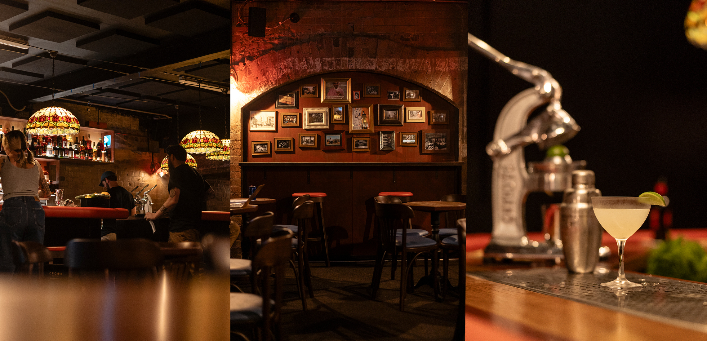 Descend the narrow staircase and you’re instantly transported. The air hums with old-world charm – exposed brick walls, flickering red tealights, and the soft glow of leadlight lamps cast shadows that dance across the room. The space oozes sophistication and nostalgia, paying homage to Brisbane’s retro underground bar scene. Every detail feels intentional – from the scattered wooden tables to the framed photographs lining the walls – creating an atmosphere that’s equal parts energetic and intimate, where conversations linger and last drinks come too soon.