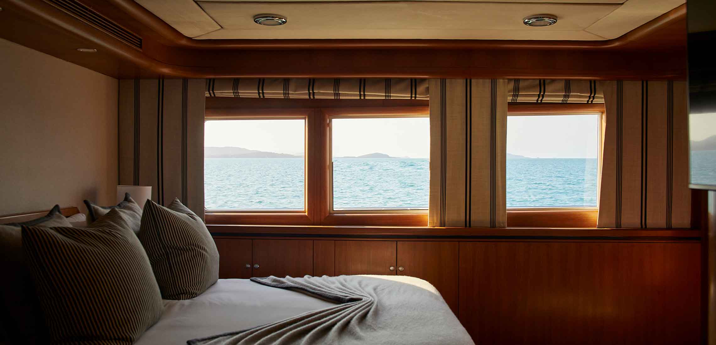 Think 101 feet of floating bliss, spread across three artfully styled decks by designer Tamsin Johnson (designer of Raes on Wategos) , recently refit by Chapman Yachting with a reimagined sundeck made for Champagne moments and salty hair. Whether you’re sipping sundowners, swimming off the back of the boat, or curling up under the stars with a post-dinner digestif, this is your ‘escape the group chat’ getaway – wrapped in sea breeze and polished brass.