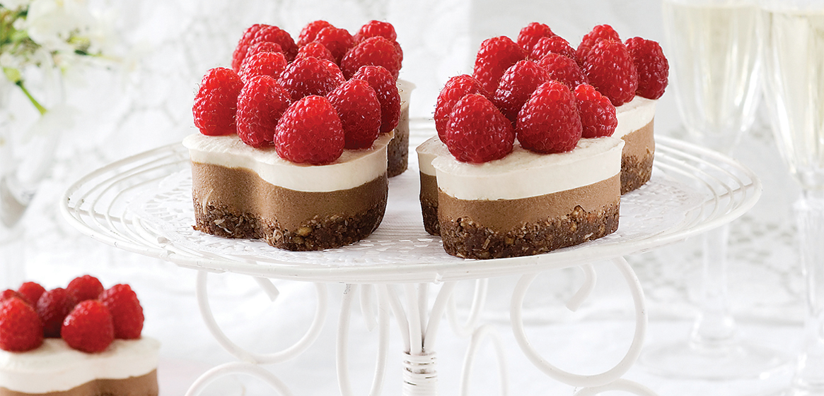 Process all ingredients until crumbly and no large chunks remain. Taste and adjust. Add more sweetener if desired. Pinch the mixture together between your fingers – if it holds its shape it’s the right consistency. If not, add 1 Tbsp of cold water at a time until the desired consistency is achieved. Press the base into the bottom of six individual heart shaped moulds and place in the freezer as you prepare the layers.
