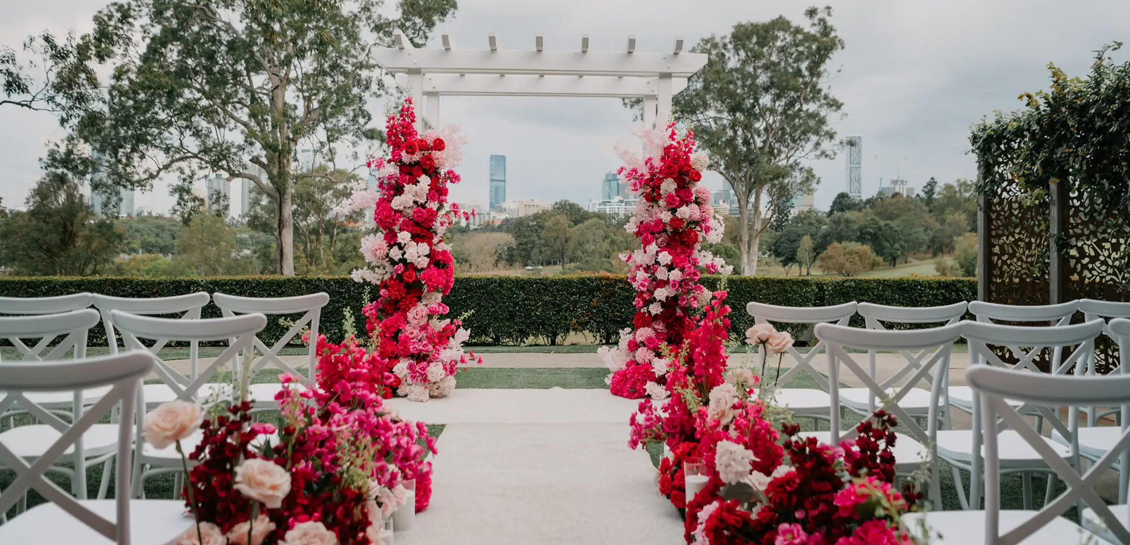 Victoria Park boasts five award-winning reception venues, each featuring a private bar, exclusive outdoor deck, and awe-inspiring city views. Whether you’re envisioning an intimate affair or a grand celebration, there’s a space tailored to your love story. With beautifully styled reception and ceremony spaces, breathtaking views of the city skyline, and lush parkland surroundings, this venue is a dream come true.